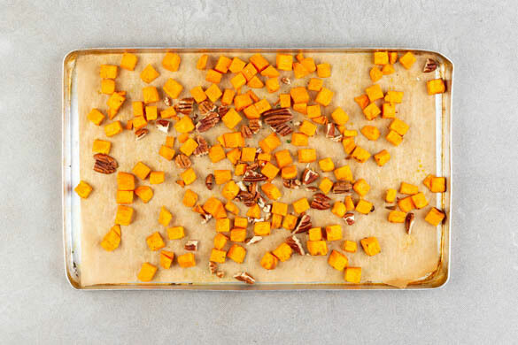 Die Süßkartoffel ggf. schälen, in ca. 1cm große Würfel schneiden und auf einem mit Backpapier ausgelegten Backblech mit 1EL Olivenöl sowie je 1 kräftigen Prise Salz und Pfeffer vermengen. Zu den Rouladen in den Ofen geben und in ca. 15Min. goldbraun und knusprig backen. Die Pekannüsse grob hacken und während der letzten ca. 7Min. auf dem Blech mitrösten.