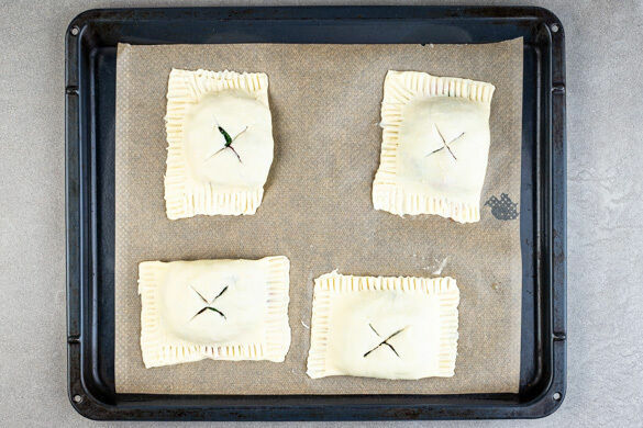 Die linke Seite des Teigs jeweils über die Füllung falten und die Ränder mit einer Gabel festdrücken. Die Teigtaschen mit der Handfläche leicht flach drücken und in jede Oberseite vorsichtig ein Kreuz schneiden. Die Teigtaschen 20–25Min. im Ofen backen, bis sie durchgegart und goldbraun sind.