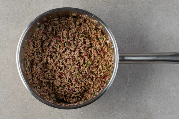 In einem mittelgroßen Topf 2EL Wasser zum Kochen bringen. Sobald das Wasser kleine Bläschen wirft, das Hackfleisch sowie 1EL Fischsauce dazugeben und bei mittlerer Hitze 6–8Min. köcheln lassen, bis das Hackfleisch gar ist.