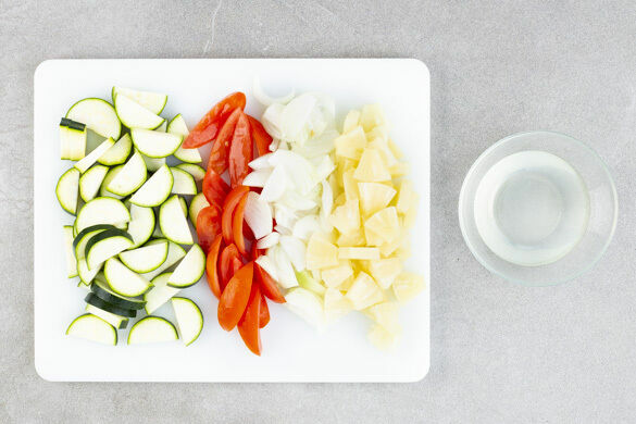 In einem kleinen Topf 400ml leicht gesalzenes Wasser für den Reis zum Kochen bringen. Die Zucchini längs halbieren und quer in dünne Scheiben schneiden. Die Tomaten entkernen und in dünne Spalten schneiden. Die Zwiebel schälen, halbieren und in dünne Streifen schneiden. Die Ananas in einem Sieb abtropfen lassen, dabei den Saft auffangen.