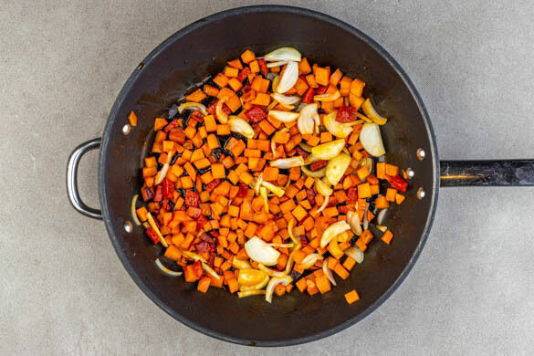 Die Süßkartoffeln und die Chorizo in einer großen Pfanne mit 2EL Olivenöl bei mittlerer Hitze 4–5Min. braten, bis die Chorizo knusprig ist und die Süßkartoffeln leicht weich sind. Die Zwiebeln und je 1 kräftige Prise Salz und Pfeffer hinzugeben und 2–4Min. glasig braten.