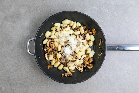 Die Pilze mit der ½ des Käses und 100–150ml Wasser zu den Gnocchi in die Pfanne geben, alles gut verrühren und ca. 2Min. erwärmen, bis eine cremige Sauce entsteht. Falls erforderlich, löffelweise mehr Wasser hinzugeben. Falls die Sauce zu dünn ist, etwas länger eindicken lassen. Mit ggf. mehr Sojasauce sowie Salz und Pfeffer abschmecken.