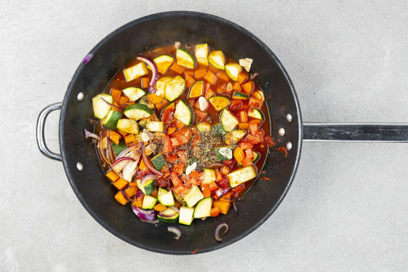 Die Zwiebeln, die Karotten, die Zucchini und die restlichen Tomaten in einer großen Pfanne mit 2EL Olivenöl 2–3Min. scharf anbraten. Den Knoblauch und das Tomatenmark unterrühren, mit 300ml Wasser ablöschen und 2–3Min. köcheln lassen. Dann mit Salz, Pfeffer, Zucker und der Gewürzmischung nach Geschmack würzen und mit dem Hähnchen und den Kartoffeln servieren.