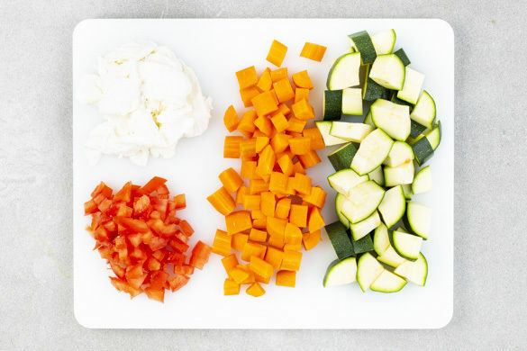 Die Zucchini längs vierteln und in ca. 1cm breite Stücke schneiden. Die Karotten ggf. schälen, längs vierteln und in kleine Würfel schneiden. Die Tomaten vierteln, vom Kerngehäuse befreien und ebenfalls in kleine Würfel schneiden. Den Mozzarella in dünne Scheiben schneiden.