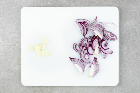 Die Zwiebeln schälen, halbieren und in feine Streifen schneiden. Den Knoblauch schälen und in dünne Scheibchen schneiden.