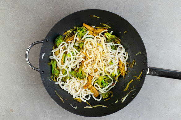 Das Gemüse aus der Pfanne nehmen und beiseitestellen. Das Fleisch in der Pfanne mit 1EL Pflanzenöl bei starker Hitze ca. 3Min. scharf anbraten, dann das Gemüse, ca. ⅔ des Currypulvers oder mehr nach Geschmack sowie die Nudeln dazugeben und ca. 1Min. mitbraten.