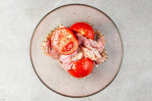 Das Fleisch und die Tomaten nach ca. 15Min. Garzeit zu dem Gemüse auf das Backblech geben und im Ofen 20–25Min. backen, bis das Fleisch gar und das Gemüse appetitlich gebräunt ist.