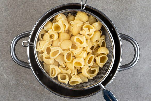 Die Pasta in das kochende Wasser geben und in 9–11Min. bissfest kochen. Mit einer Tasse etwas Pastawasser abschöpfen, dann die Pasta in ein Sieb abgießen und abtropfen lassen. Die Pasta zurück in den Topf geben und mit 1TL Olivenöl vermengen.