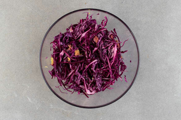 Den Backofen auf 200°C (180°C Umluft) vorheizen. 50ml Essig und 50ml Wasser mit 1EL Zucker und 2TL Salz in einem kleinen Topf zum Kochen bringen, dabei gelegentlich umrühren. Den Topf vom Herd nehmen. Den Ingwer schälen und fein reiben. Den Rotkohl in feine Streifen schneiden. Den Ingwer und den Rotkohl mit dem Einlegesud vermengen.