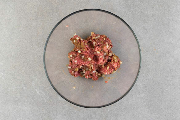 Den Knoblauch schälen und sehr fein würfeln oder durch eine Knoblauchpresse drücken. Die Zwiebeln schälen, halbieren und fein würfeln. Das Hackfleisch mit dem Knoblauch, der ½ der Zwiebeln, der Gewürzmischung und je ½TL Salz und Pfeffer verkneten.