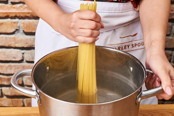 Die Pasta in das kochende Wasser geben und in 7–9Min. bissfest kochen. Ca. 150ml Pastawasser abschöpfen, dann die Pasta in ein Sieb abgießen und kalt abschrecken.