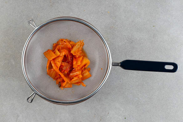 Den Backofen auf 220°C (200°C Umluft) vorheizen. Das Kimchi in ein Sieb abgießen und abtropfen lassen, dabei die Flüssigkeit auffangen. Das Kimchi grob zerkleinern.