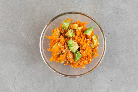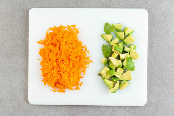 Die Karotten ggf. schälen und grob raspeln. Die Avocados halbieren, den Kern entfernen und das Fruchtfleisch in der Schale kreuzweise zu ca. 3cm großen Würfeln einschneiden. Die vorgeschnittenen Avocadowürfel mit einem Löffel aus der Schale lösen.