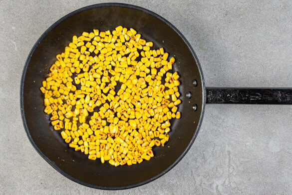 Den Mais in ein Sieb abgießen und abtropfen lassen. Den Mais in einer mittelgroßen Pfanne ohne Zugabe von Fett bei mittlerer bis starker Hitze 4–5Min. scharf anbraten, bis er leichte Röstspuren zeigt, dann mit 1 Prise Salz würzen, aus der Pfanne nehmen und beiseitestellen.