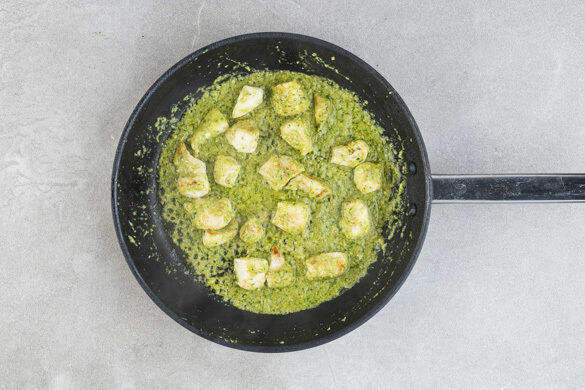 Die Paprika und den Lauch in einer großen Pfanne mit 2EL Pflanzenöl und 1 Prise Salz bei mittlerer Hitze 2–3Min. anbraten. Dann die Currypaste unterrühren und ca. 2Min. mitbraten.