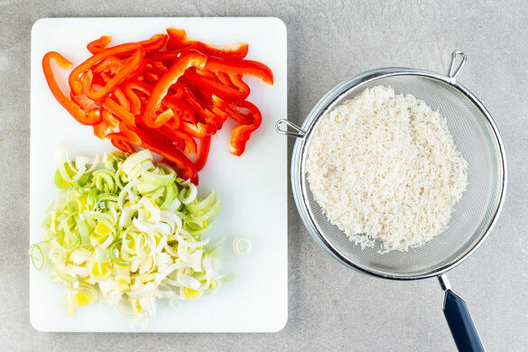 Die Paprika vierteln, entkernen und in dünne Streifen schneiden. Den Lauch längs halbieren und quer in feine in Streifen schneiden. Den Reis in einem Sieb unter fließendem Wasser abspülen, bis das Wasser klar bleibt.