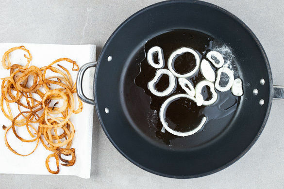 1EL Mehl mit je 1 Prise Salz und Pfeffer mischen. Die Zwiebel schälen und in ca. 0,5cm dünne Ringe schneiden. Die Schichten voneinander lösen und die Zwiebelringe einzeln im Mehl wenden. 2EL Olivenöl in der Pfanne bei mittlerer Hitze erwärmen und die Zwiebelringe von beiden Seiten knusprig braten, anschließend auf Küchenkrepp abtropfen lassen.