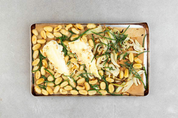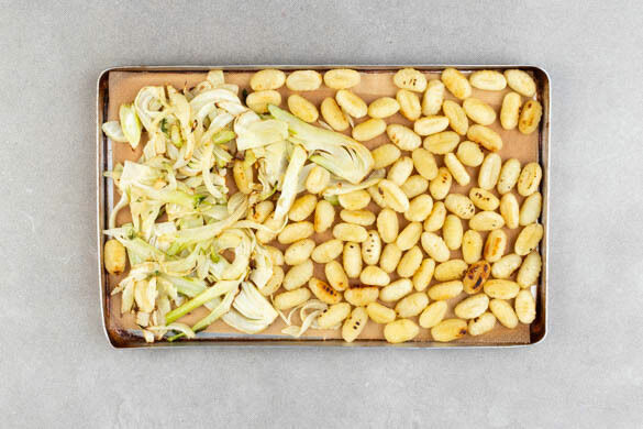 Den Fenchel und die Gnocchi auf einem mit Backpapier ausgelegten Backblech mit 4EL Olivenöl, der Gewürzmischung und je ½TL Salz und Pfeffer vermengen, ggf. ein zweites Blech verwenden. Ca. 15Min. im Ofen backen, ggf. die Position der Bleche nach der Hälfte der Zeit tauschen.