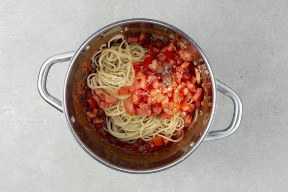 Die Basilikumblätter von den Stängeln zupfen. Die Pasta mit der Tomatensauce und den Tomatenwürfeln vermengen, nach Geschmack mit Salz und Pfeffer würzen.
