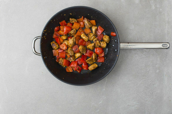 Die Paprika vierteln, entkernen, in mundgerechte Stücke scheiden und in einer großen Pfanne mit 2EL Olivenöl bei mittlerer Hitze ca. 2Min. anbraten. Das Fleisch und den Knoblauch dazugeben und 4–5Min. mitbraten, bis das Fleisch gar ist. Mit Salz, Pfeffer und der restlichen Gewürzmischung abschmecken.