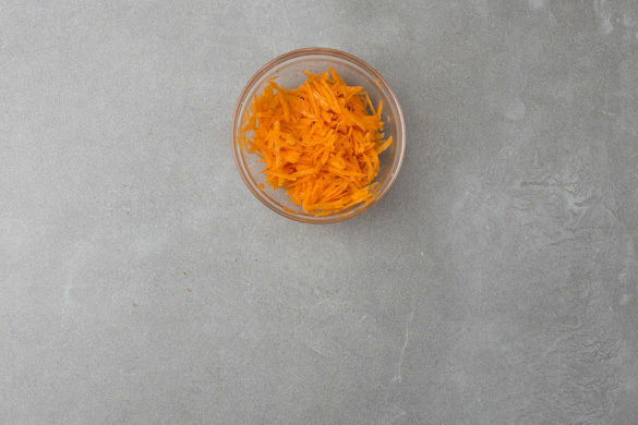 Die Karotten ggf. schälen, mit einer Küchenreibe grob raspeln und mit 3EL Essig, ½–1TL Zucker und 1 Prise Salz vermengen und beiseitestellen.