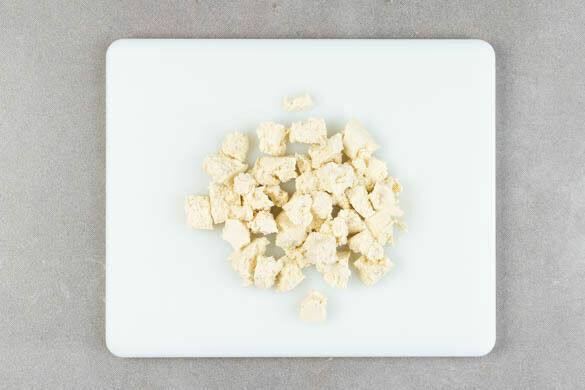 In einem Wasserkocher ausreichend Wasser für die Nudeln zum Kochen bringen. Den Tofu in mundgerechte Stücke zerkleinern. Die Nudeln mit heißem Wasser bedecken und 3–5Min. gar ziehen lassen. In ein Sieb abgießen, kalt abschrecken und abtropfen lassen.