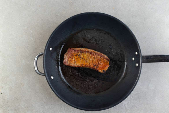Eine große Pfanne ohne Öl stark erhitzen, dann das Fleisch mit 1EL Olivenöl in die Pfanne geben und auf jeder Seite 2–3Min. braten, abhängig davon, ob es medium oder eher durchgebraten sein soll. Aus der Pfanne nehmen und bis zum Servieren auf einem Teller abgedeckt ruhen lassen.