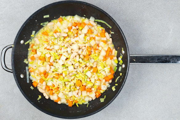 Die Karotten und den Kohlrabi in einer großen Pfanne mit 2–3EL Pflanzenöl bei mittlerer Hitze 2–3Min. anbraten. Den Lauch und 1TL Kümmel dazugeben und 1–2Min. mitbraten. Die Bohnen unterrühren, mit der Brühe ablöschen und einmal aufkochen lassen. Mit Salz und Pfeffer nach Geschmack würzen.