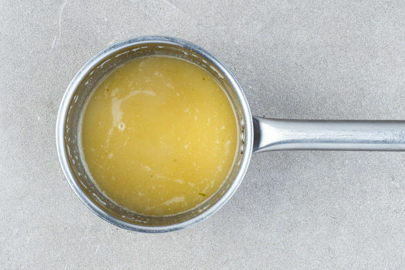 Die Bohnen in einem Sieb über einem kleinen Topf abtropfen lassen. Die Bohnenflüssigkeit mit 100ml Wasser und dem Brühgewürz aufkochen.