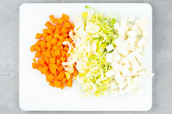 Den Lauch längs halbieren und in feine Streifen schneiden. Die Karotte ggf. schälen, längs vierteln und in kleine Würfel schneiden. Den Kohlrabi schälen und ebenfalls in kleine Würfel schneiden.