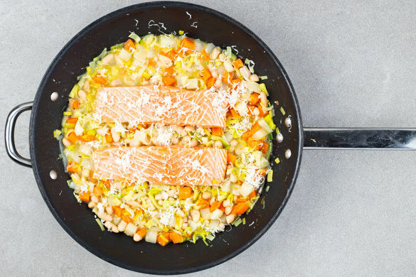 Der Lachs gehört unbestritten zu den beliebtesten Speisefischen. Er lässt sich äußerst vielseitig zubereiten und sein saftiges, festes Fleisch hat einen feinen Geschmack. Heute servierst du den Küchenliebling mit frischem Meerrettich gegart auf einer delikaten Gemüsepfanne mit Cannellinibohnen, Karotten, Kohlrabi und Lauch, die mit Kümmel und Dill abgeschmeckt wird. Guten Appetit!