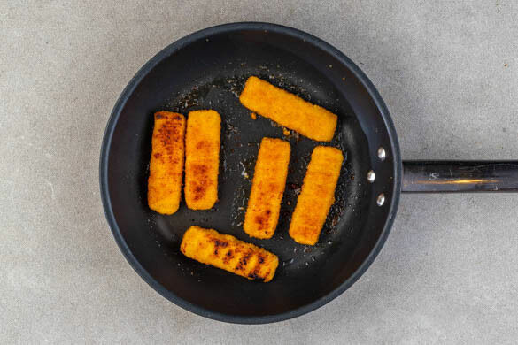 Die veganen Fischstäbchen in der Tortillapfanne mit 1½EL Pflanzenöl bei mittlerer bis starker Hitze auf einer Seite goldbraun anbraten, dann wenden und weiterbraten, bis sie rundum appetitlich gebräunt und knusprig sind.
