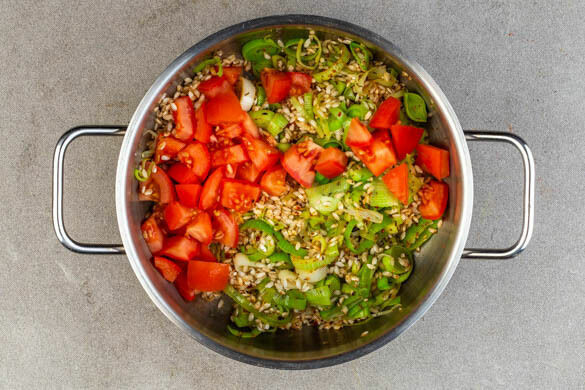Den Lauch in dünne Ringe schneiden und mit 2EL Butter in einem großen Topf bei mittlerer Hitze in ca. 5Min. glasig braten. Das Brühgewürz in 1,5L heißem Wasser auflösen. Die Tomaten grob würfeln.