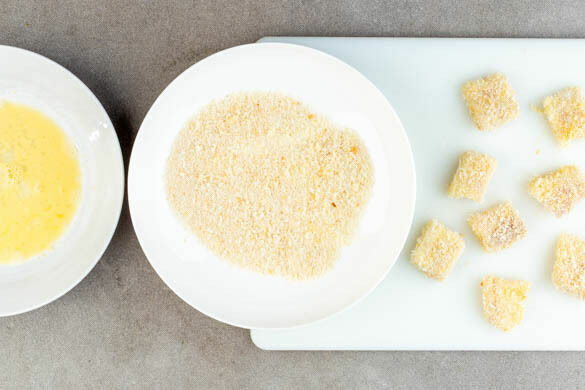 Auf einem tiefen Teller 1 Ei verquirlen. Das Panko-Paniermehl auf einen zweiten tiefen Teller geben. Den Fisch von beiden Seiten mit je 1 Prise Salz und Pfeffer würzen, dann erst im Ei und anschließend im Panko-Paniermehl wenden.