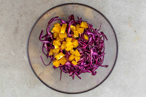 Die ½ der Orangenschale abreiben, dann die Orange halbieren und eine Hälfte auspressen, die andere Hälfte schälen und grob würfeln. Den Rotkohl in feine Streifen schneiden und mit 1EL Essig, 1TL Orangenschale und je 1 kräftigen Prise Salz, Pfeffer und Zucker verkneten. Die Orangenwürfel und den Orangensaft mit dem Rotkohl vermengen und beiseitestellen.