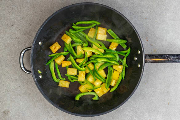 Die Paprika vierteln, entkernen und in dünne Streifen schneiden. Die Ananas in einem Sieb abtropfen lassen, dabei den Saft auffangen. Die ½ der Ananas oder mehr mit 1EL Pflanzenöl in einer mittelgroßen Pfanne bei mittlerer bis starker Hitze 3–4Min. anbraten. Die Paprika zugeben und 3–4Min. mitbraten, bis sie leicht gebräunt ist. Mit je 1 kräftigen Prise Salz und Pfeffer würzen.