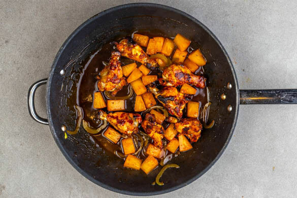 Das Fleisch in die Pfanne geben und gleichmäßig schwenken, bis es von allen Seiten mit der Glasur überzogen ist. Das Fleisch auf dem Reis anrichten, mit den restlichen Kokosraspeln und dem Koriander garnieren und mit dem Coleslaw servieren.