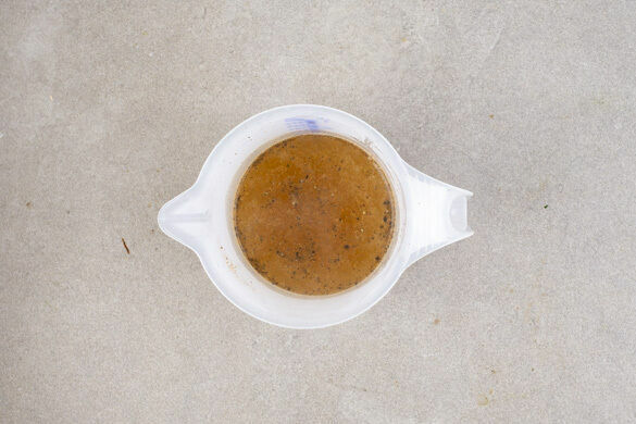 Das Brühgewürz in 600ml heißem Wasser auflösen. Die ½ der Gewürzmischung unterrühren und die Brühe mit Salz und Pfeffer abschmecken. Das Fleisch aus dem Kühlschrank nehmen und Raumtemperatur annehmen lassen.