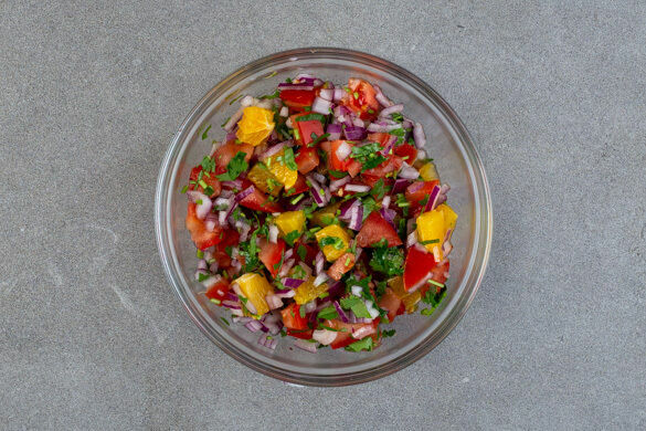 Die Tomaten in kleine Würfel schneiden. Den Koriander samt Stängeln fein schneiden. Die Zwiebel schälen, halbieren und fein würfeln. Die Tomaten, die Zwiebeln und ¾ des Korianders mit den Orangenstücken samt Saft und der ½ des Limettensafts vermengen. Die Salsa mit Salz und Pfeffer abschmecken.
