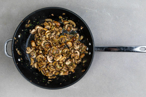 Den Backofen auf 220°C (200°C Umluft) vorheizen. In einem Wasserkocher ca. 1L Wasser zum Kochen bringen. Die Pilze ggf. säubern und in dünne Scheiben schneiden.