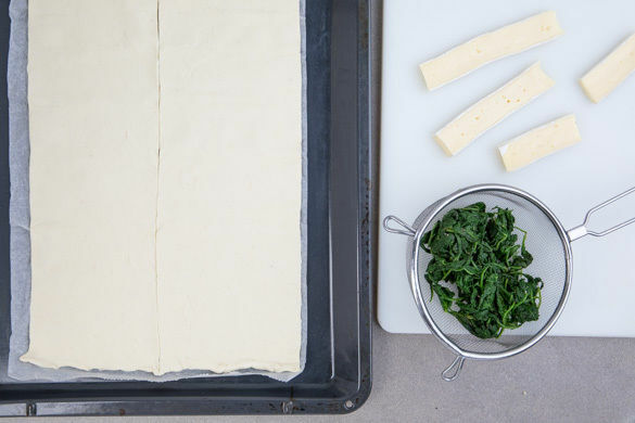 ⅔ des Spinats in ein Sieb geben und mit dem kochenden Wasser übergießen. Sofort mit kaltem Wasser abspülen und so viel Flüssigkeit wie möglich auspressen. Den Rand des Bries dünn abschneiden und den Brie in feine Scheiben schneiden. Die Teige mit dem Papier nach unten auf zwei Backblechen ausrollen und längs halbieren.