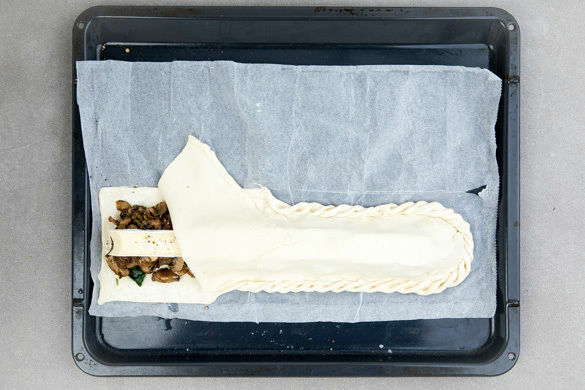 Den Spinat auf 2 Teigstreifen verteilen, dabei je 1cm Rand frei lassen. Den Spinat mit den Pilzen und dem Brie belegen. Die Ränder mit Wasser bepinseln und die Füllung mit je 1 Teigstreifen bedecken. Die Ränder schließen, dazu je 1 Teigfalte über die nächste legen. Die Strudel mit dem Sesam bestreuen und ca. 20Min. im Ofen goldbraun backen.