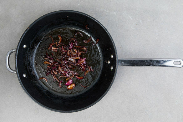 Die Zwiebel schälen, halbieren und in feine Streifen schneiden. In der Pfanne mit 1EL Olivenöl bei mittlerer Hitze 8–10Min. anbraten. 2EL Balsamicoessig, 1EL Wasser sowie Salz und Pfeffer dazugeben und verköcheln lassen.