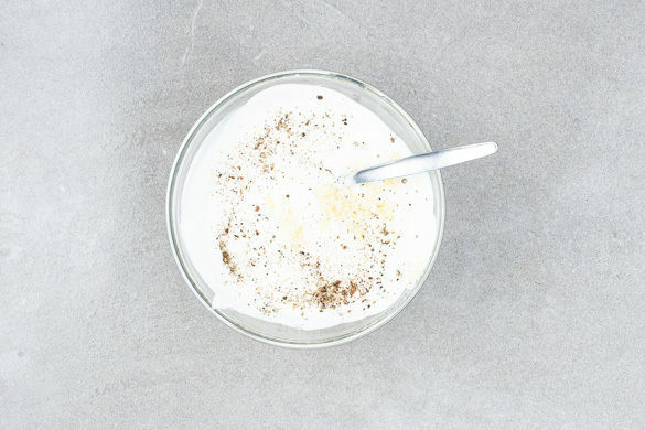Den Backofen auf 220°C (200°C Umluft) vorheizen. Den Knoblauch schälen und fein reiben oder sehr fein würfeln. Die 1/2 des Knoblauchs in den Joghurt einrühren und mit Salz und Pfeffer abschmecken.