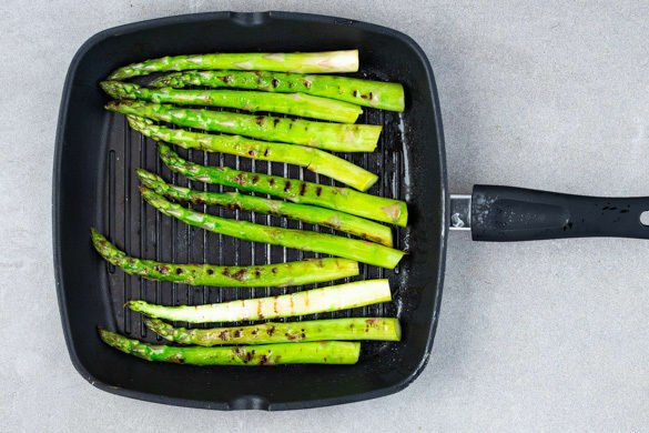 Die hölzernen Enden des Spargels abbrechen und dickere Stangen längs halbieren. Den Spargel mit 1EL Olivenöl und 1 Prise Salz vermengen und in einer Grillpfanne bei mittlerer Hitze 5–7Min. von allen Seiten grillen, dann in der Pfanne warm halten.