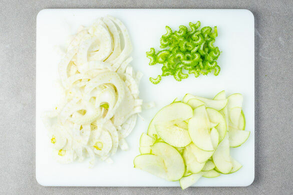 Den Fenchel längs halbieren, vom Strunk befreien und in sehr feine Streifen schneiden oder hobeln. Den Sellerie in dünne Scheiben schneiden. Den Apfel vierteln, entkernen und in dünne Scheiben schneiden.