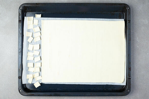 Den Teig mit dem Papier nach unten auf einem Backblech ausrollen. An einer kurzen Seite zwei ca. 1cm breite Teigstreifen abschneiden und in kleine Quadrate zerteilen.