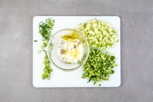 Den Joghurt mit der restlichen Zitronenschale verrühren und mit Salz und Pfeffer abschmecken. Dann die Apfel- und Gurkenwürfel sowie die grünen Lauchzwiebelringe untermischen und den Dip mit dem restlichen Zitronensaft und 1EL Olivenöl verfeinern.