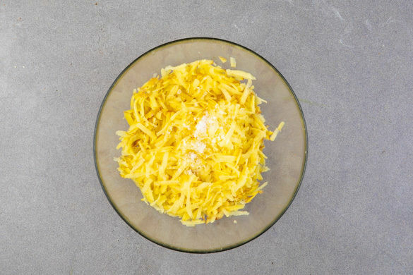 Die Kartoffeln samt Schale mit einer Küchenreibe grob raspeln. Die Pastinake ggf. schälen und ebenfalls grob raspeln. Das Gemüse mit 1 kräftigen Prise Salz vermengen und beiseitestellen.