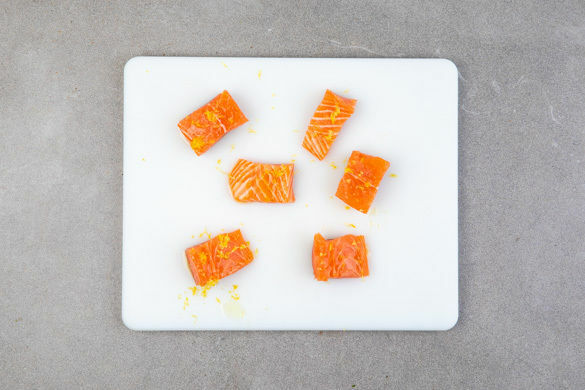 Den Lachs mit kaltem Wasser abspülen, trocken tupfen und in ca. 6 gleich große Stücke schneiden, dabei evtl. vorhandene Gräten und die Haut entfernen. Mit der 1/2 der Zitronenschale und 1EL Olivenöl einreiben.
